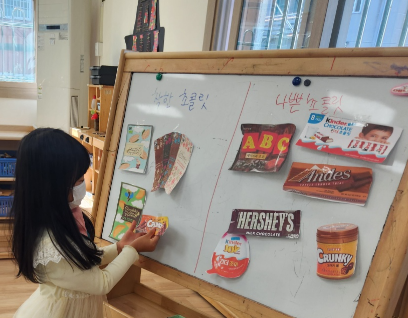 Change your chocolate: 초콜릿을 바꾸세요, 불공정하고 인권이 유린될 뿐 아니라 아동 노동 폭력이 자행되고 있는 카카오(코코아) 산업, 국제공정무역기구가 장기간 전세계 140여개국에서 시행해온 대표적인 공정무역 캠페인이다. 일일 공정무역 활동가로 참여한 인천삼성어린이집 친구들은, 카카오(코코아) 산업에서 자행되고 있는 아동 노동 및 아동이 누릴 수 있는 권리에 대해 살펴보기, 나쁜 초콜릿과 착한 초콜릿의 예를 찾아보거나 오려붙이기 등 다양한 놀이경험을 통해 공정무역에 대해 알아보고 권리를 존중받아야 하는 친구들을 위한 배려의 실천방법으로 일일 공정무역 소비 활동 캠페인을 준비했다.