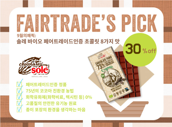 ![]() 패어트래이드 덕후, 패덕님들 많이 기다리셨죠? 9월에도 패덕님을 실망시키지 않는 패픽레터 스페인 프리미엄 공정무역인증 초콜릿 8종을 엄선하여 준비해보았습니다. 이미 국내 많은 마니아층을 확보하고 있는 솔레 바이오 초콜렛 시리즈, 9월 한 달만, 30% 할인한 기회를 (더 보기) ![]() 혹시, 우리 아이에게 아직도 초콜릿맛 농약을 먹이고 있는 건 아니죠? (더 보기)