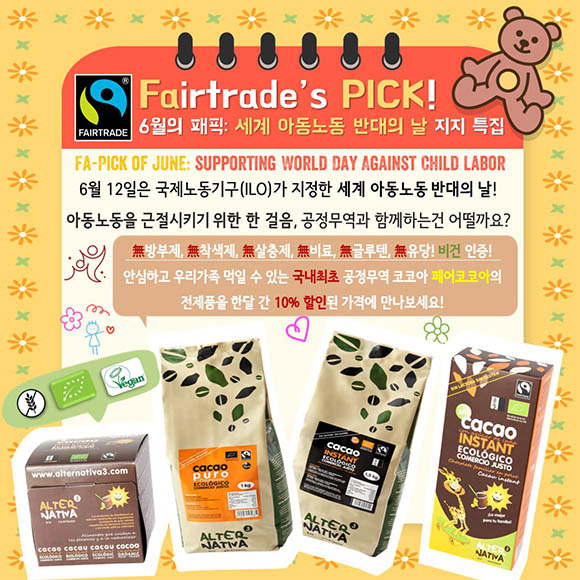 ![]() 안녕하세요, 패덕님들! 6월 12일은 국제노동기구(ILO)에서 지정한 세계 아동노동 반대의 날 이랍니다! 아동노동은 지금 이 순간에도 전세계 카카오 농장에서 광범위하게 일어나고 있습니다. 아동노동을 반대하며, 공정한 대우와 지속가능한 농업관행을 지원하며 만들어진 페어코코아 제품을 10% 할인된 가격으로 만나보세요! 이제 갓 출시된 국내 최초 공정무역인증 코코아인건 안비밀! 흔치 않은 기회!