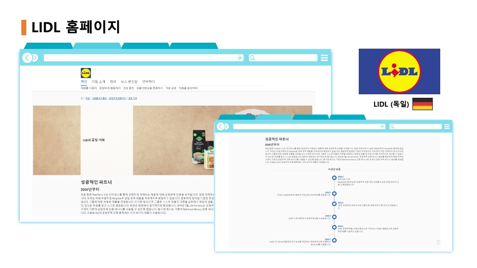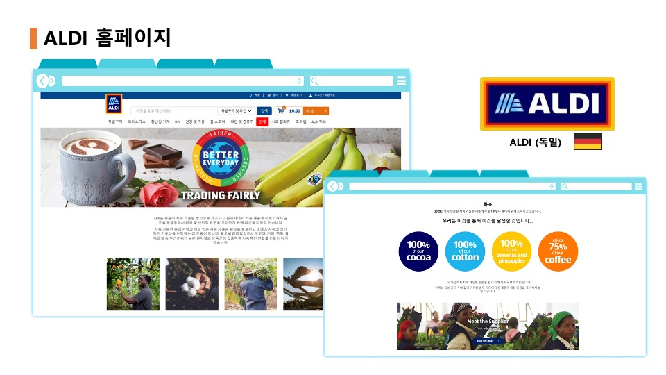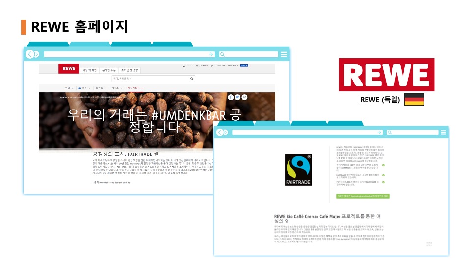 유럽의 식음료 및 기타 유통 시장을 점유하고 있는 십 수개의 브랜드 마트, 프랜차이즈 유통사들의 웹사이트와 온라인 매장을 방문하면 홈페이지 처음부터 공정무역 사무소인지, 순간 착각할 정도로 공정무역 상표로 도배되어 있을 정도이다. 독일: Lidl, Aldi, Rewe