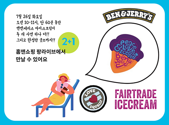 ![]() 국제공정무역기구 한국사무소와 홈앤쇼핑이 여름 특집으로 시원하게 '벤엔제리스 2+1' 이벤트를 준비했습니다. 7월 26일 화요일 오전 10-11시, 단, 60분 동안 진행하는, 사람을 위하고 지구를 위하는 공정무역인증 아이스크림, 벤엔제리스 2+1 공구, 홈앤쇼핑 라이브커머스 팡라이브에서 만 (더 보기) ![]() 벤엔제리스가 공정무역인증 라이센시 기업이라는 사실 알고 계셨나요? 지금 만나보세요 (더 보기)