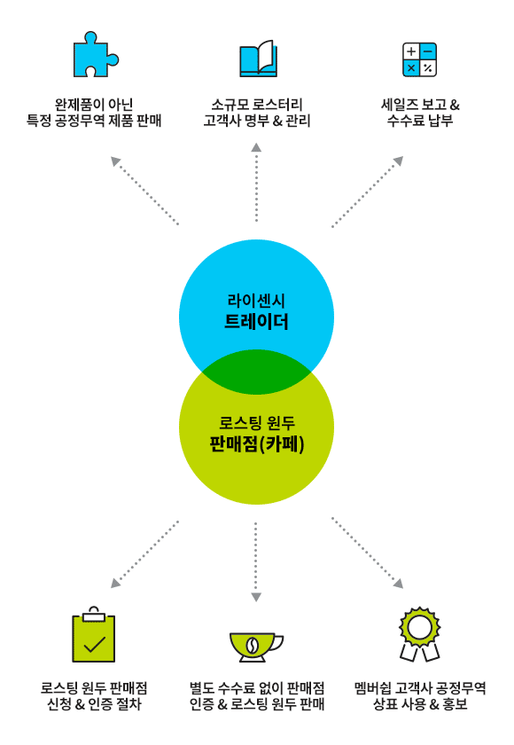 공정무역인증 소형 로스팅 판매점으로 인증 받은 경우, 국내 최초로 완제품이 아닌 공정무역 생두를 직접 로스팅한 원두를 소분하여 포장 및 판매가 가능합니다. 별도 수수료 없이, 인증만으로 자격이 부여됩니다.